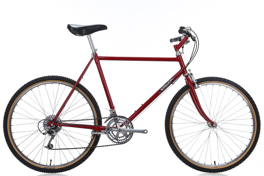 This early Swift mountain bike is constructed of fillet brazed steel and features some of the standard mountain bike specific equipment of the time: a Shimano Deore XT and Suntour drivetrain, thumb shifters, roller cam brakes, and bullmoose style handlebars.