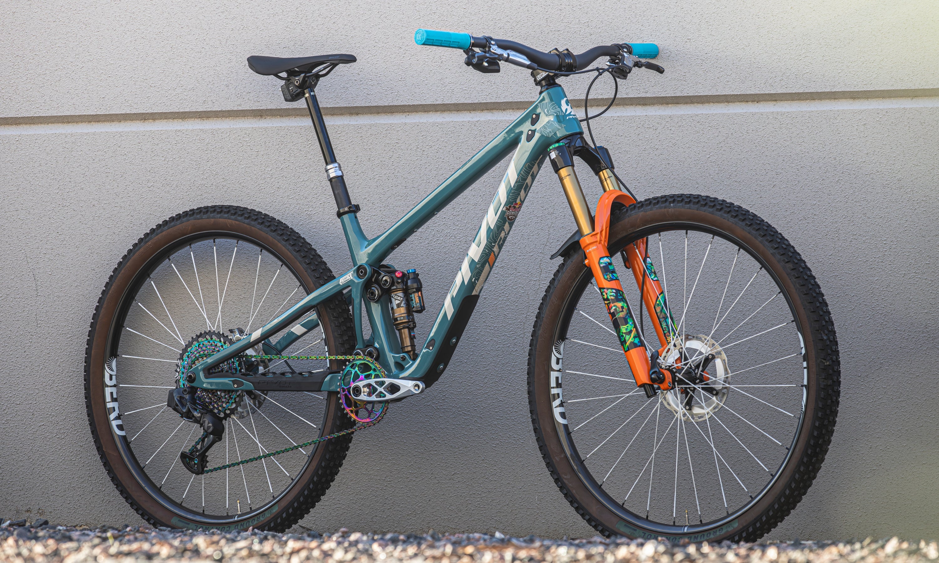 The Factory Orange Fox 36 is already pretty loud, but it’s boosted with custom oil-slick graphics that match the oil slick absoluteBLACK oval chainring, AXS chain, and XX1 cassette.
