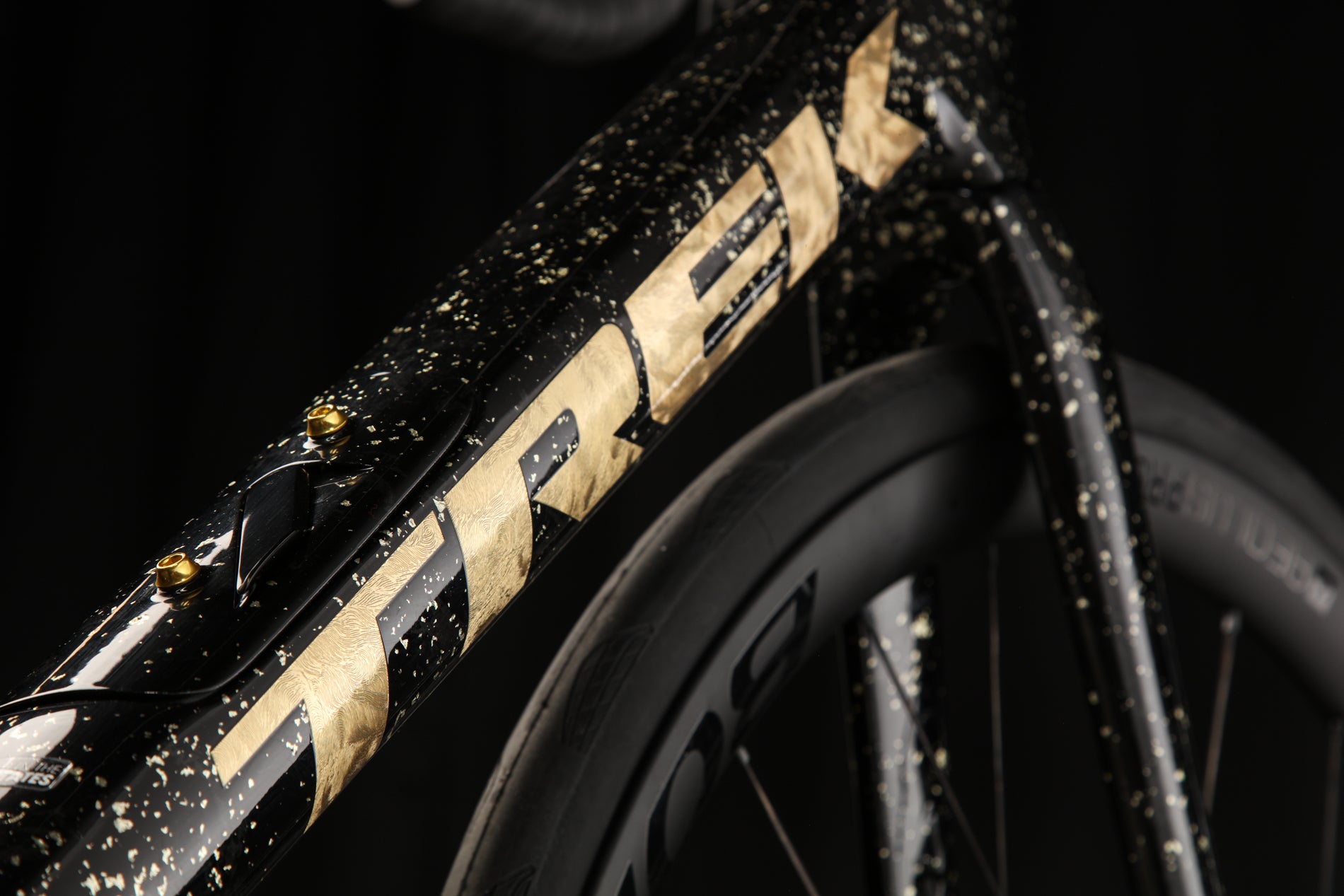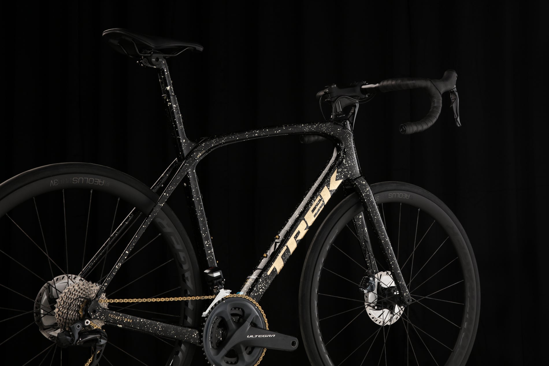 The Trek Domane is among our best selling bikes. Period. We get a lot of them, so for one to make it into our Studio Standout Series, something must be special. This Sweet Gold Leaf paint job pops - from the Trek logo on the downtube to the splatter effect throughout the frame. The Trek Domane is known as one of the best options for riders looking for a high performance Endurance road bike with generous tire clearance (claimed up to 38mm).
