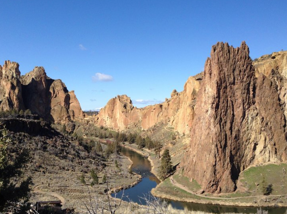 Location: Heading north from Bend on Hwy97 drive 7.5 miles to Terrebonne. From Terrebonne turn right onto Smith Rock Rd. After 2.3 miles, take a left, another left and a right in immediate succession staying on Smith Rock road. Follow the signs for Smith Rock state park. Park at the day-use area unless you intend to camp at the walk-in.