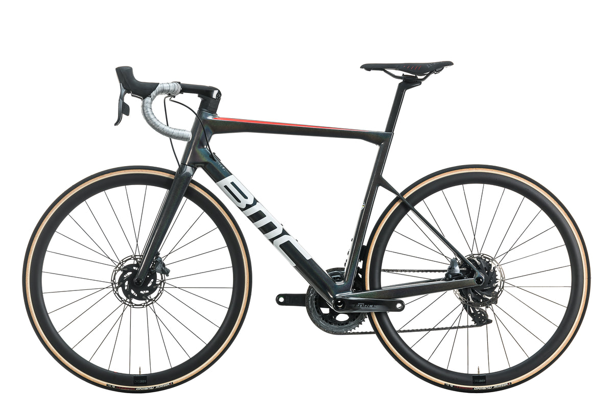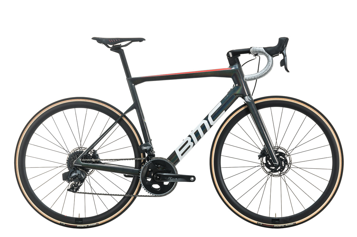 The BMC Timemachine 01 Road is a revolutionary bike that will make you look, feel, and perform like a pro. Thanks to its sleek cable management, aero-inspired frame profile, and controlled handling, athletes of all experience levels can race confidently with this impressive two-wheeler. The Timemachine is engineered with TCC Speed inside its premium carbon frame and fork, allowing maximum efficiency no matter how you ride it — sprints, rolling hills, or interval training. Outfitted with the SRAM Rival eTap AXS 12-speed groupset for wireless shifting, plus 50mm CRD-501 Carbon wheels for stability and control at high speeds, the Timemachine 01 Three Road is sure to get you across the finish line ahead of your competitors. Any cyclist can appreciate its aerodynamics that rivals some of BMC's fastest time trial bikes mixed with the comfort of their best endurance road bikes. Race like never before with the Timemachine 01 ROAD!