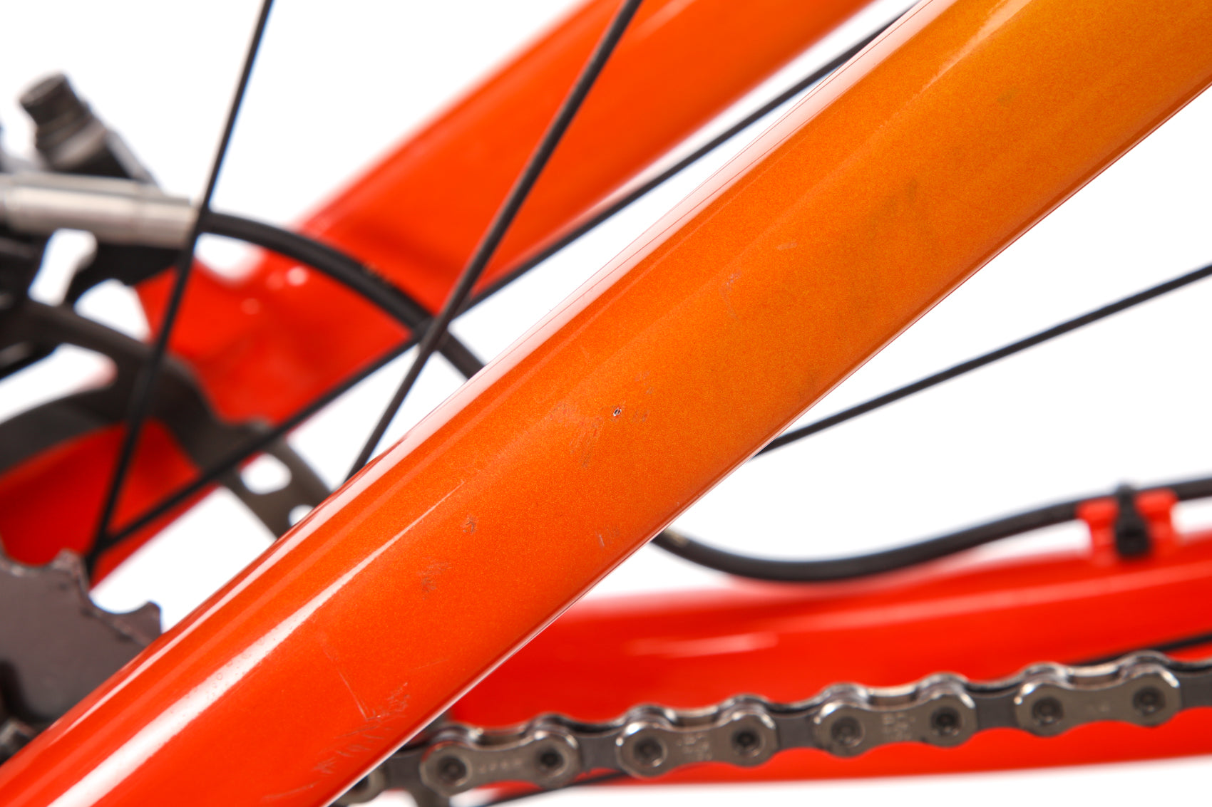 • Light scratches on the drive side seatstay, chainstay bridge, & chainstays